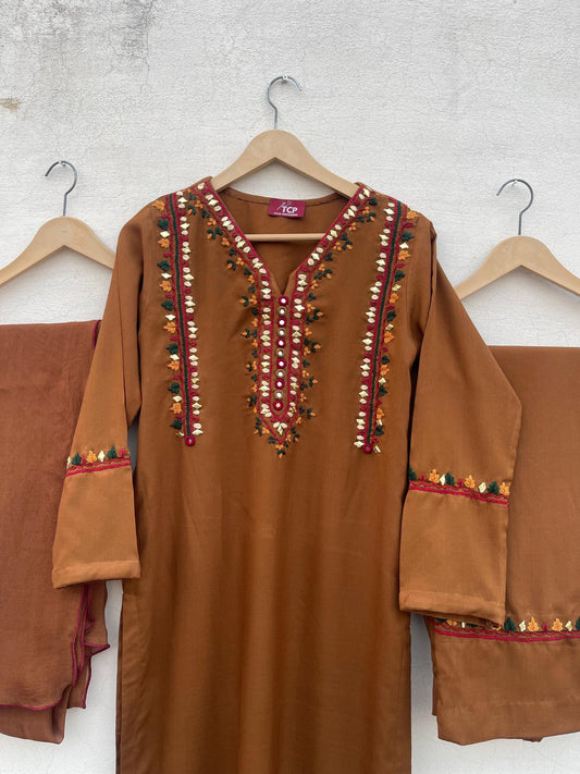 3 Piece Coffee Brown Hand Embroidered ChickenQari set