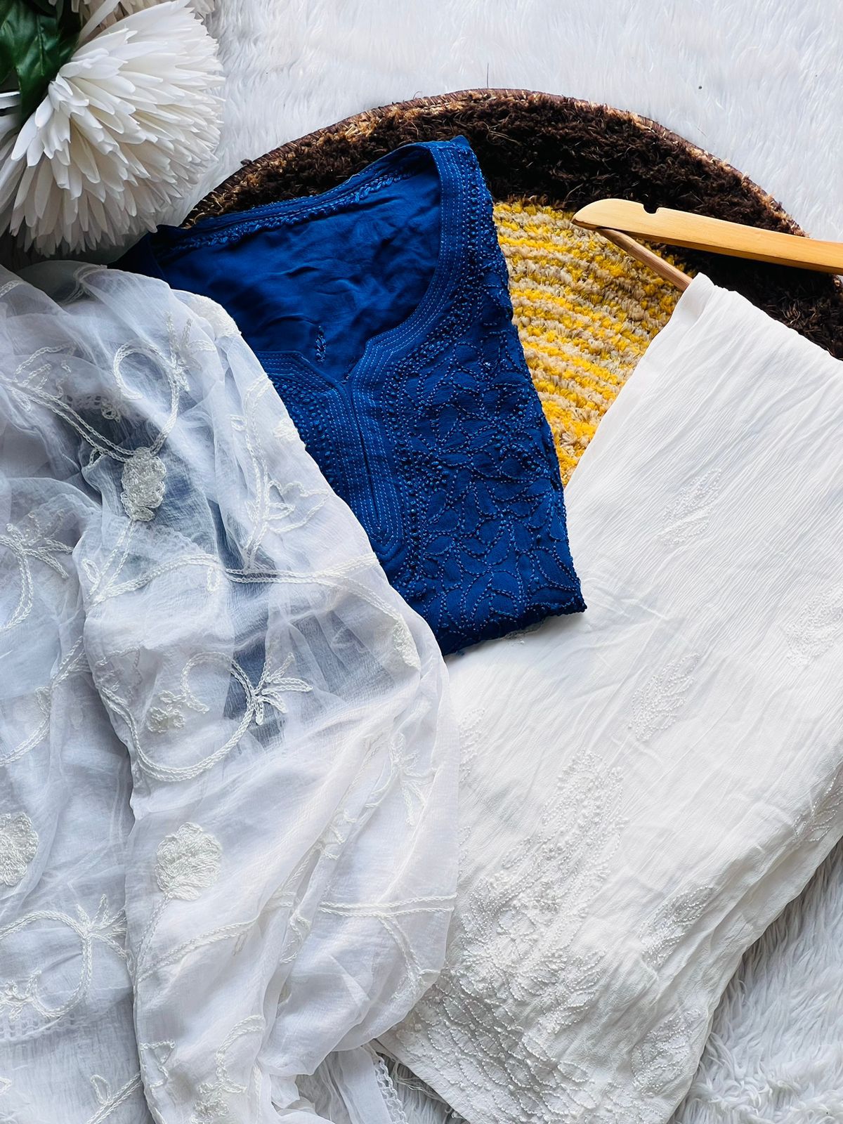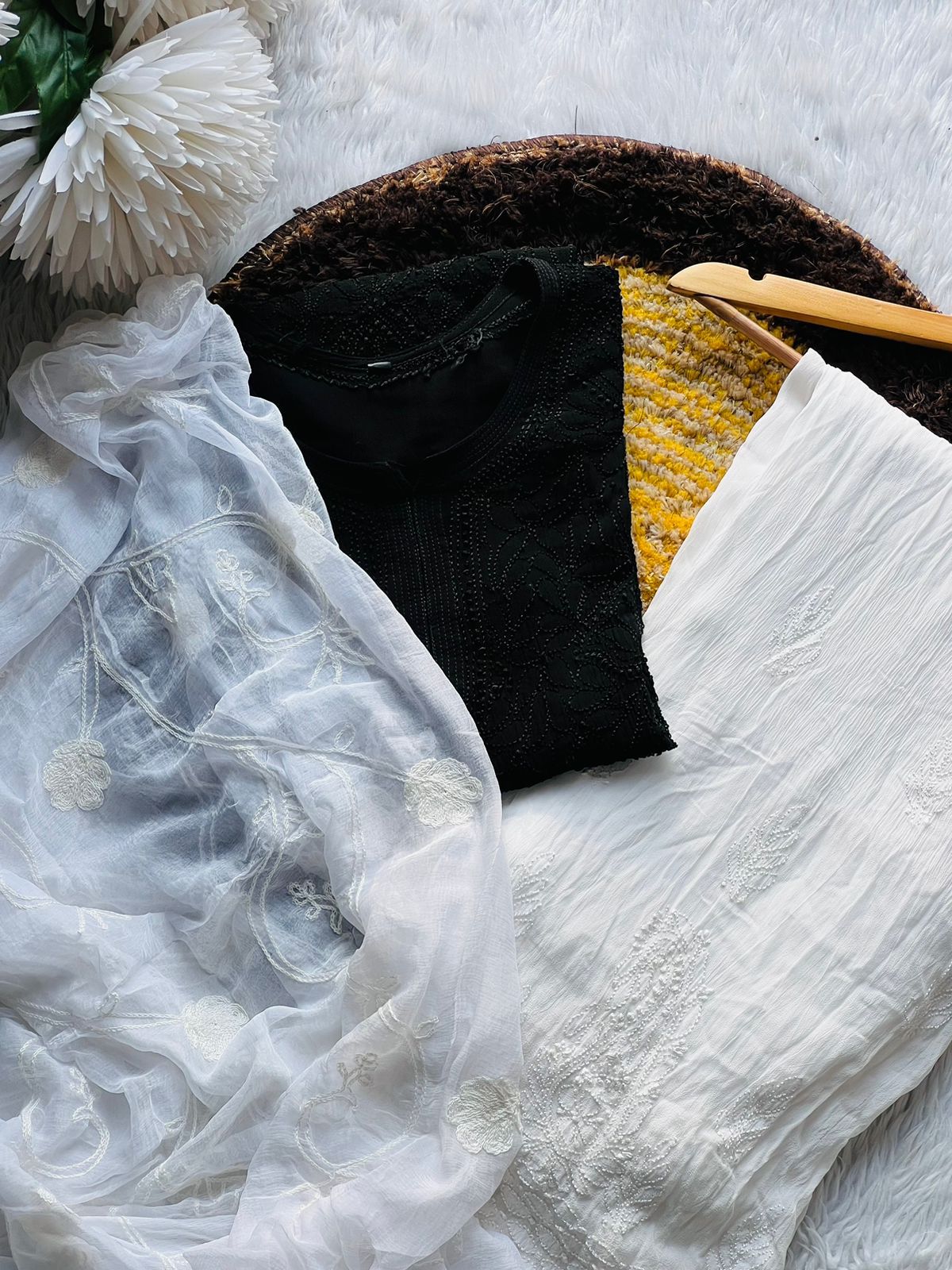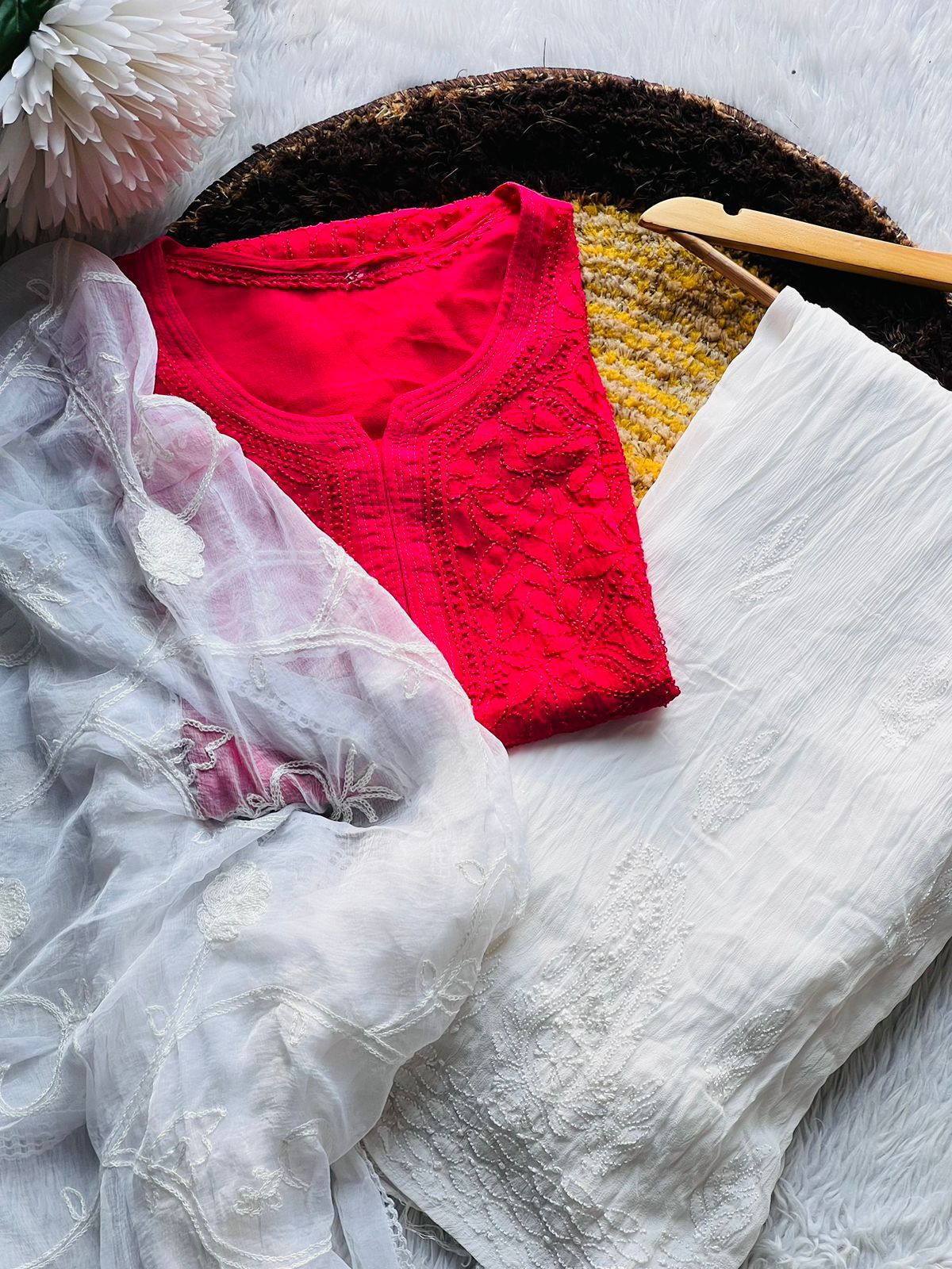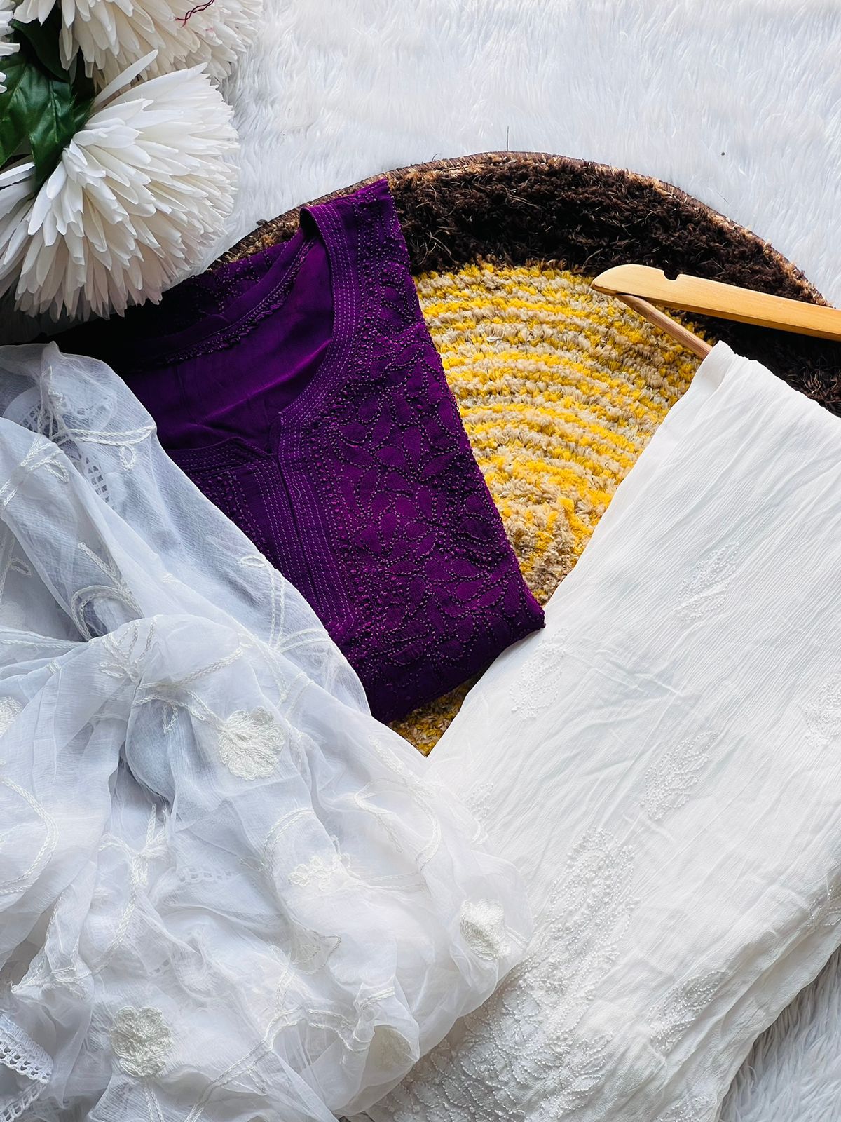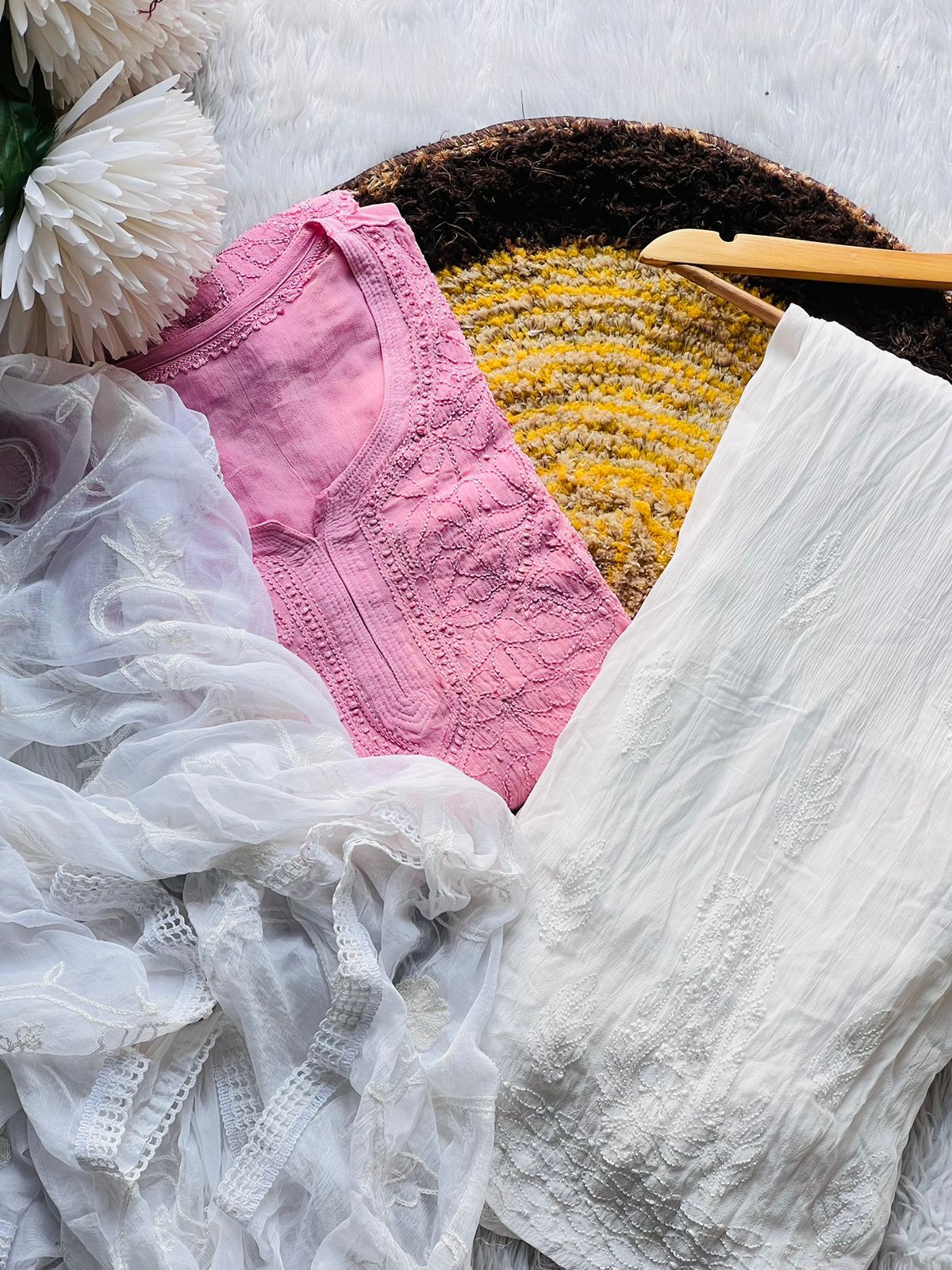 3 piece Gharara Set Premium soft Georgette soft and breathable Impeccably crafted from premium fabric, this stunning piece is adorned with intricate chikankari embroidery, exuding sophistication. Elevate your style and exude elegance with this essential suit.