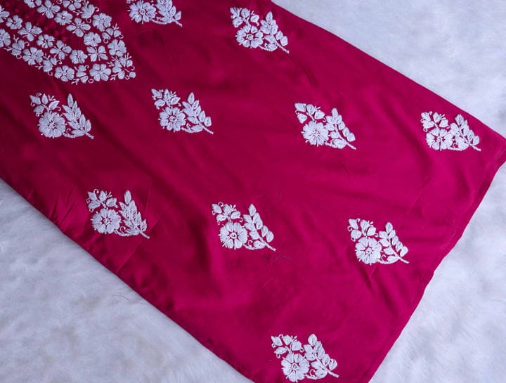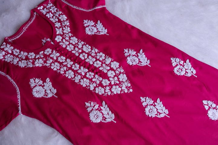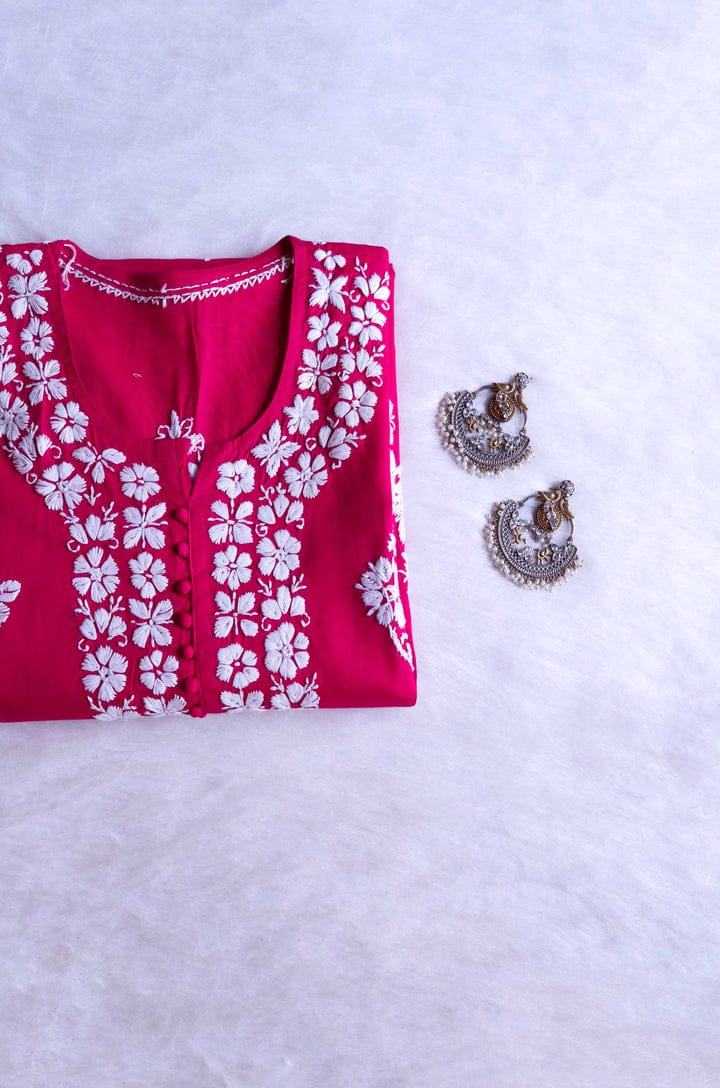 Hot Pink Long cotton kurta with White toned Hand Embroidered chikankari in delicate design with buttons on the neck.