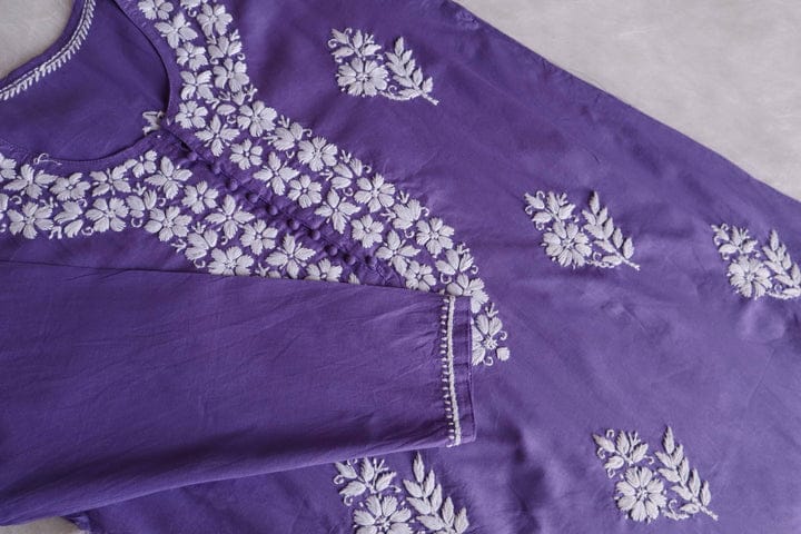 Purple Long cotton kurta with White toned Hand Embroidered chikankari in delicate design with buttons on the neck.