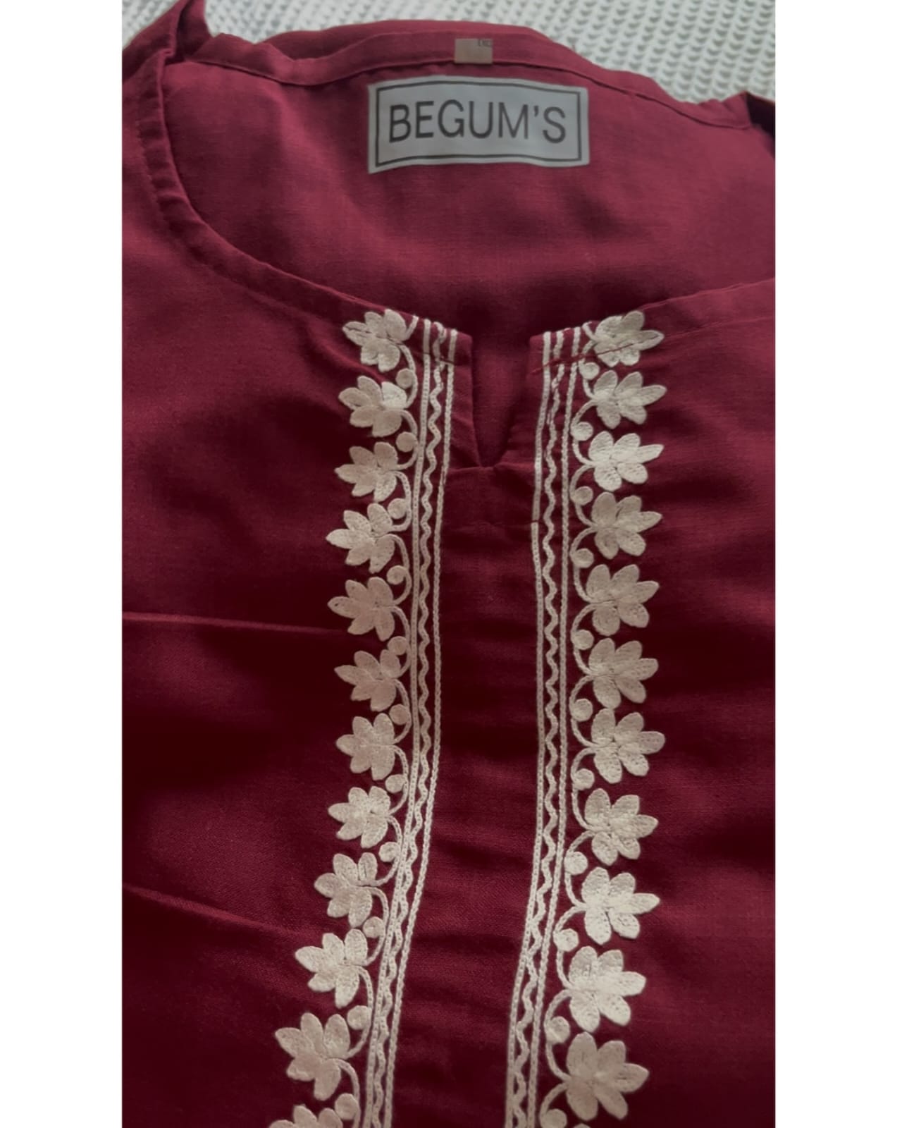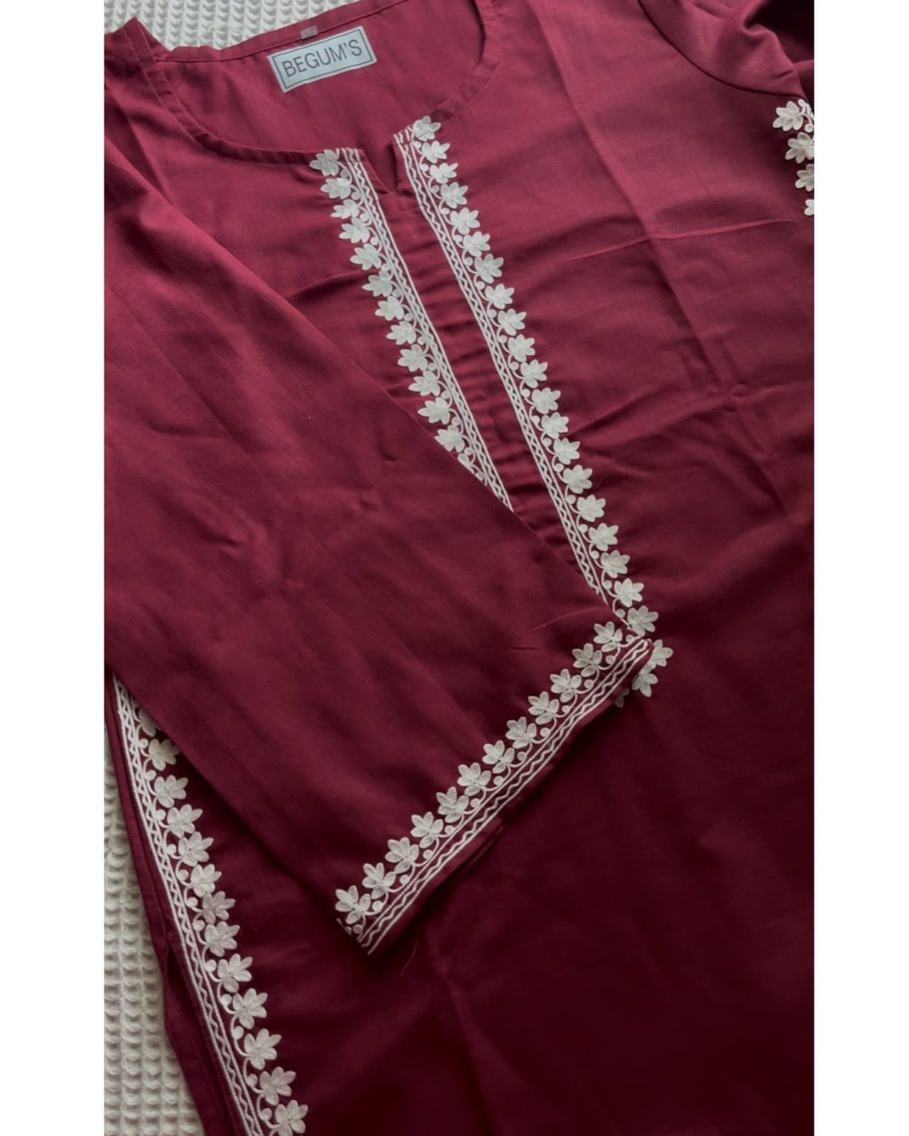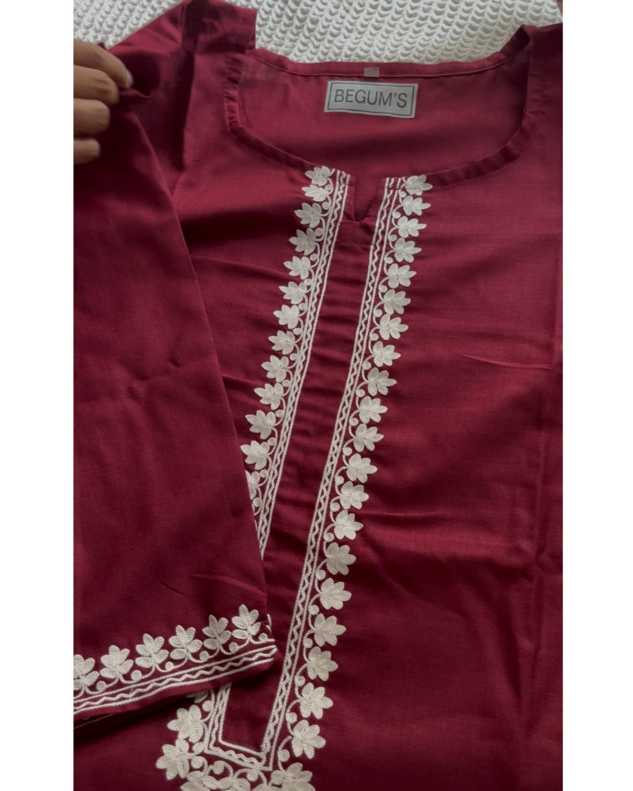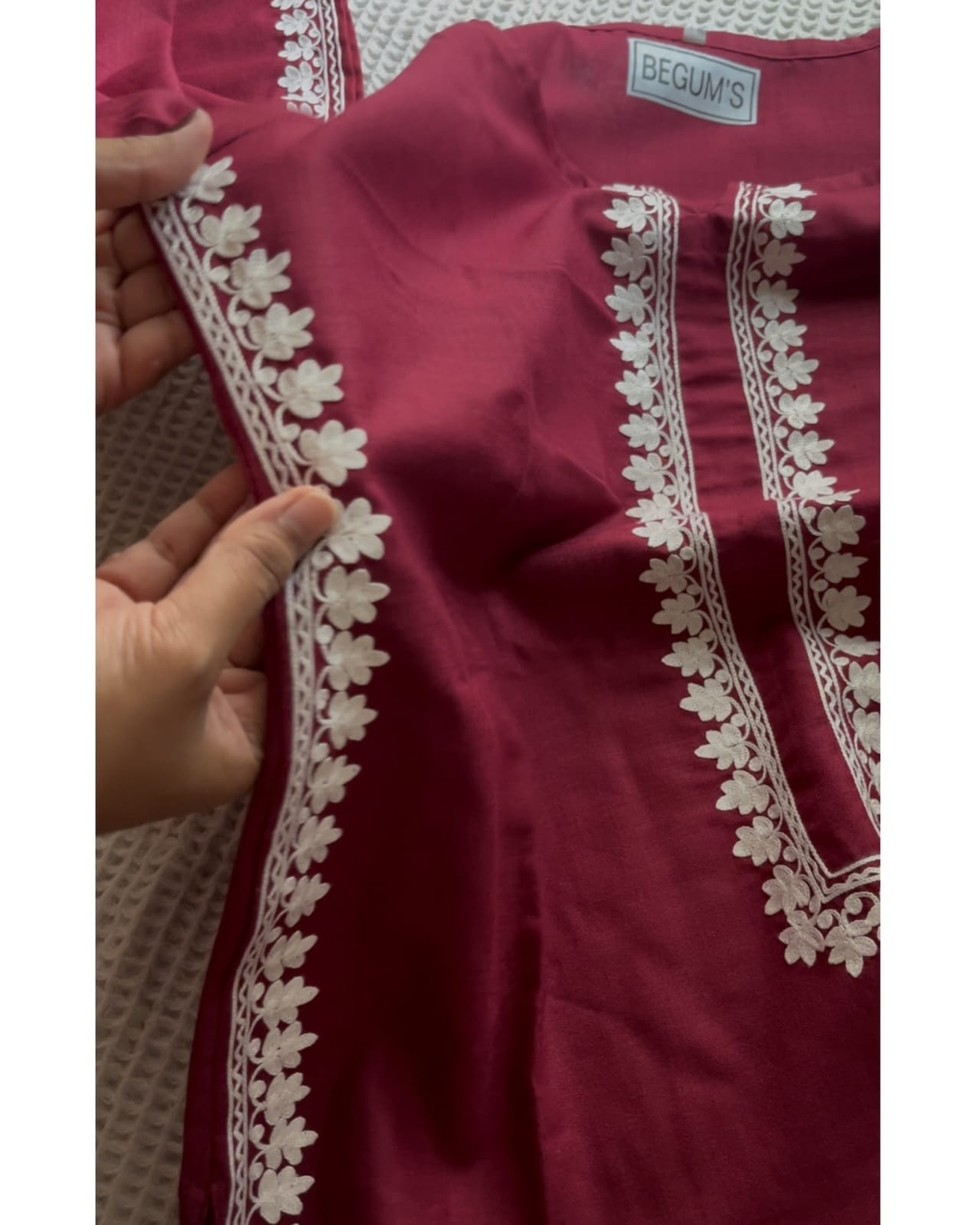 Everyones Favourite Sharjeena Maroon 2 piece CoOrd set premium quality Maina fabric With handwork in details. They're the most versatile piece of clothing you can own.